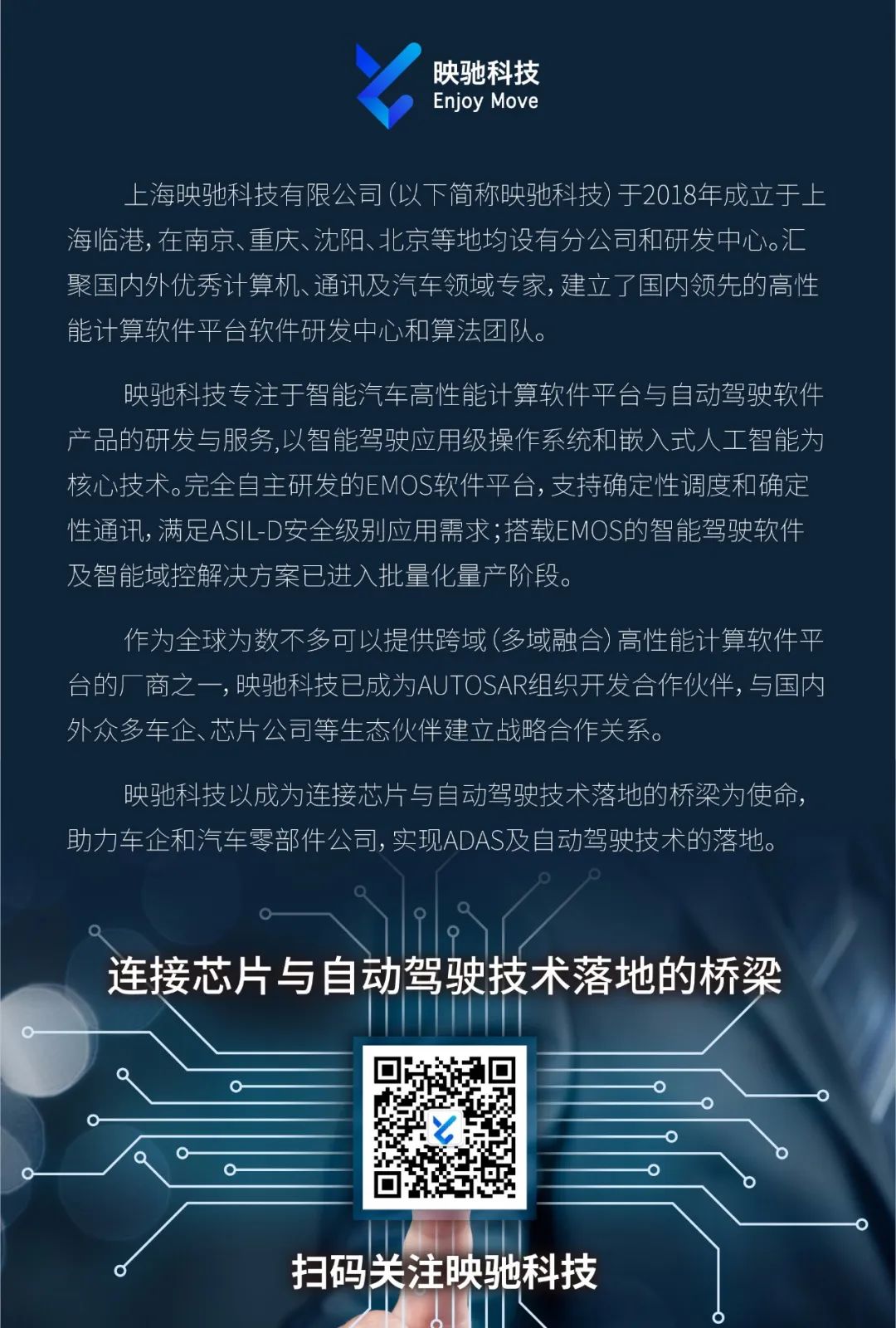 映驰科技以成为连接芯片与自动驾驶技术落地的桥梁为使命,始终致力于为客户提供安全、可靠的产品与解决方案,与生态圈伙伴广泛合作,推动智能驾驶技术的进步。